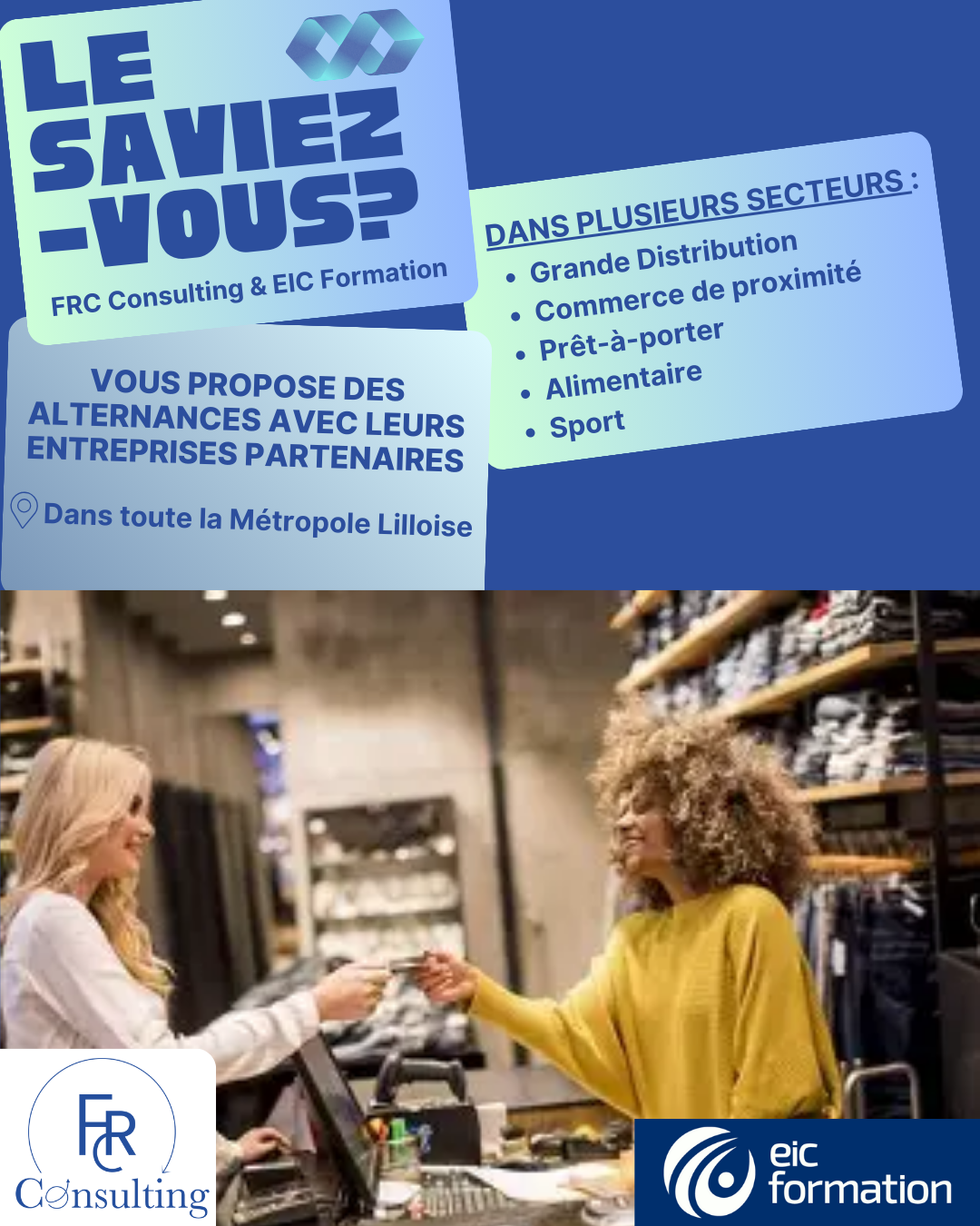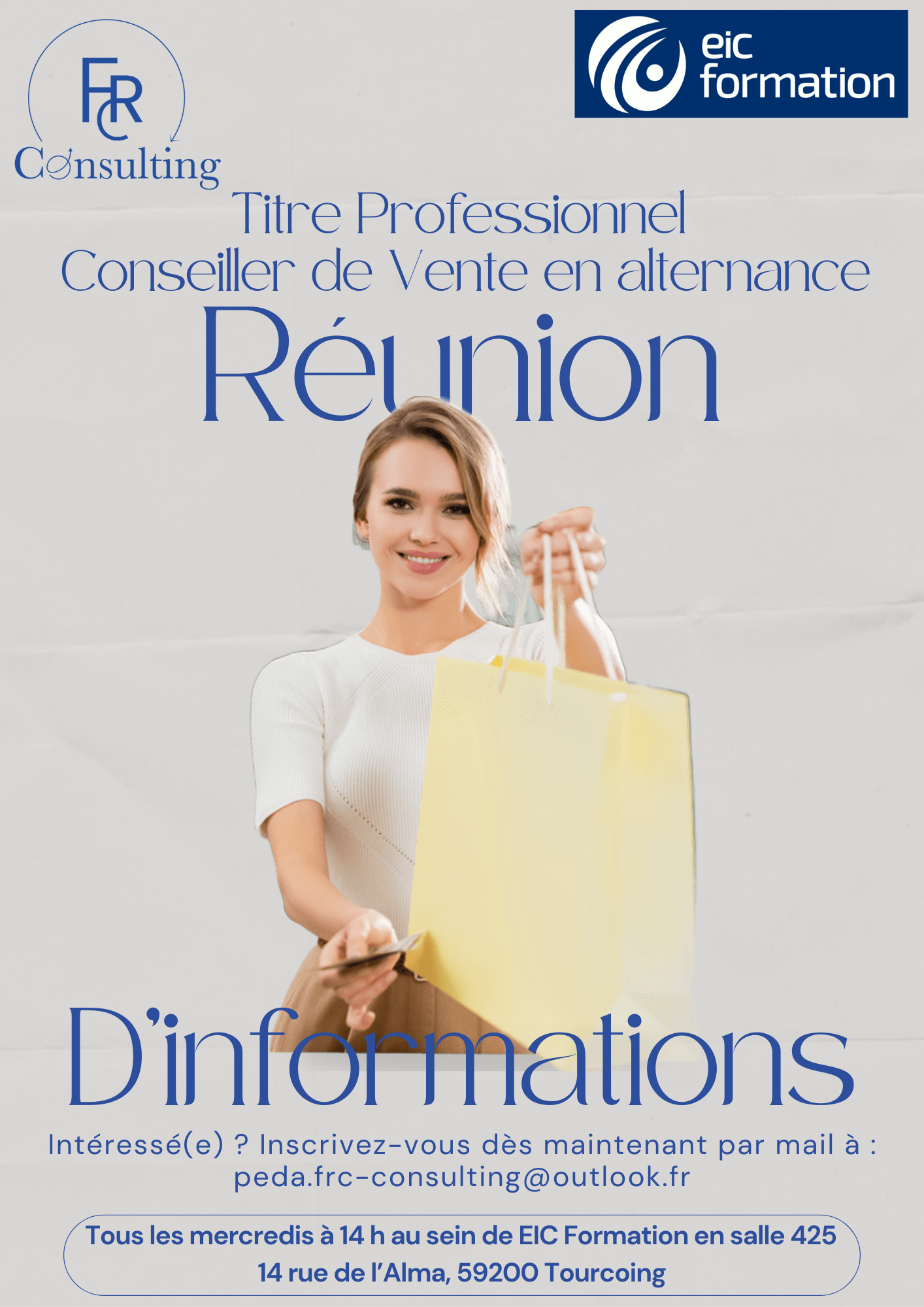 FR Consulting et EIC Formation organisent chaque mercredi à 14 h une réunion d’information pour présenter le Titre Professionnel “Conseiller de Vente en alternance”.