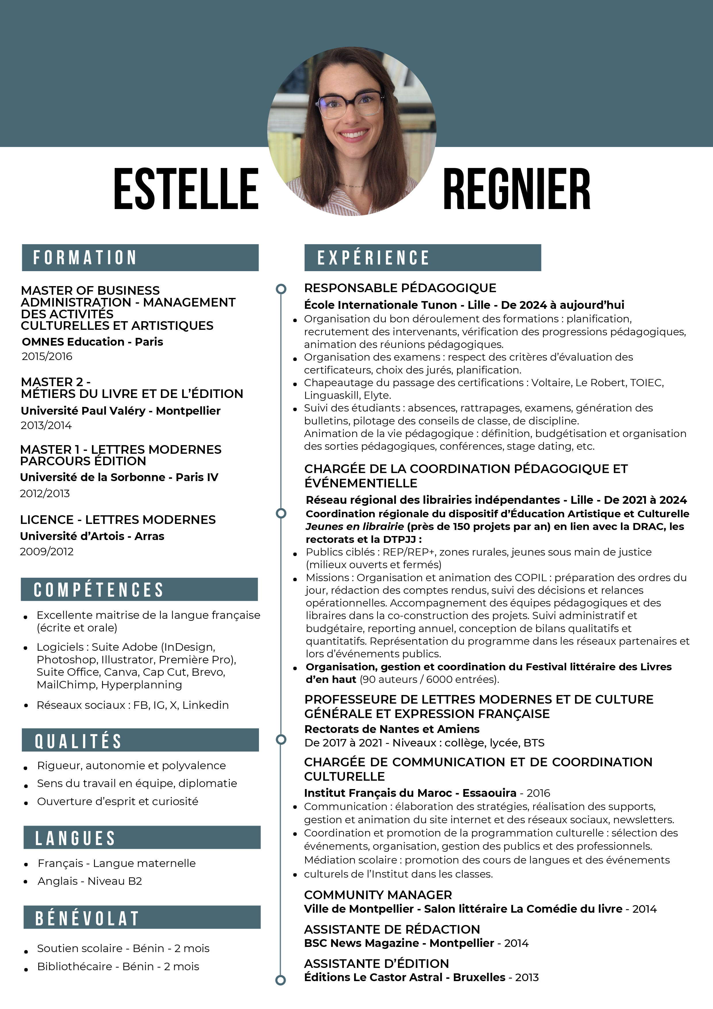 Télécharger le PDFProfessionnelle de la pédagogie et de la coordination culturelle, Estelle Regnier met son expertise au service de projets éducatifs et artistiques d’envergure. Son parcours allie rigueur, créativité et sens du collectif.